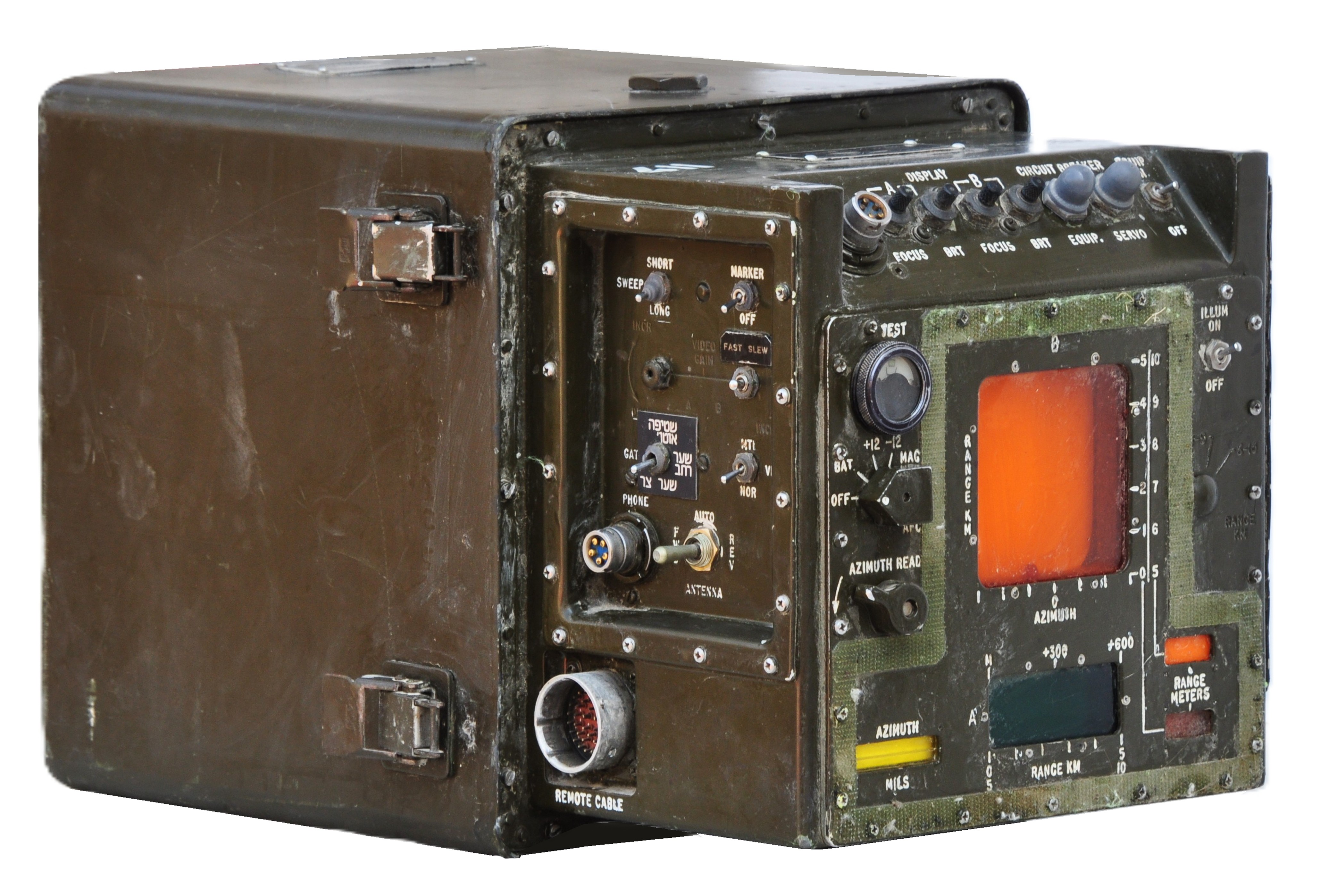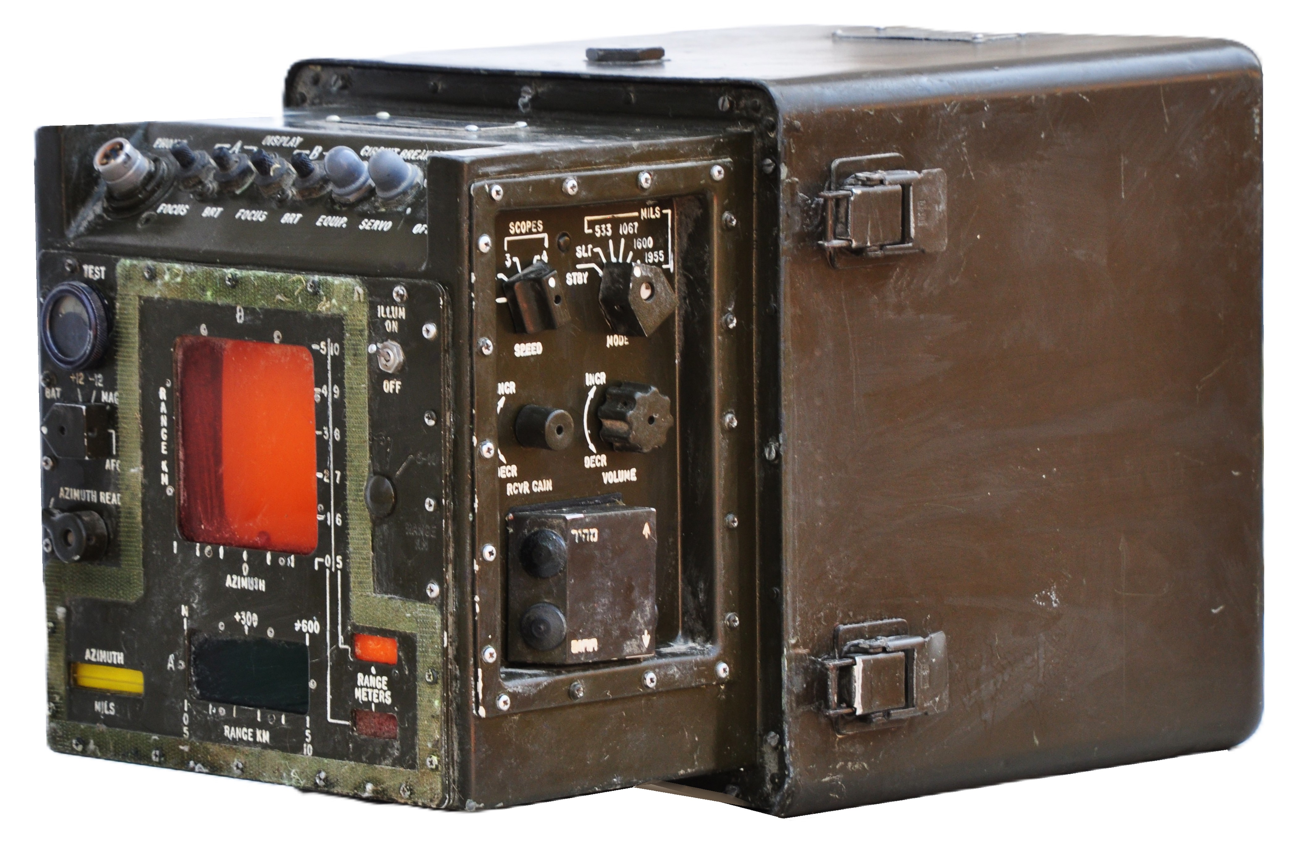 Displays target on two screens, azimuth and range). Target identification by audio signal using headsets.